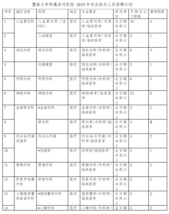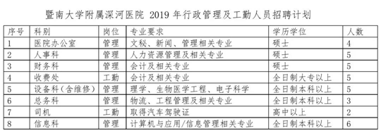 具体岗位见附件《暨南大学附属深河医院2019年行政管理及工勤人员招聘计划》、《暨南大学附属深河医院2019年专业技术人员招聘计划》。招聘工作人员725人。