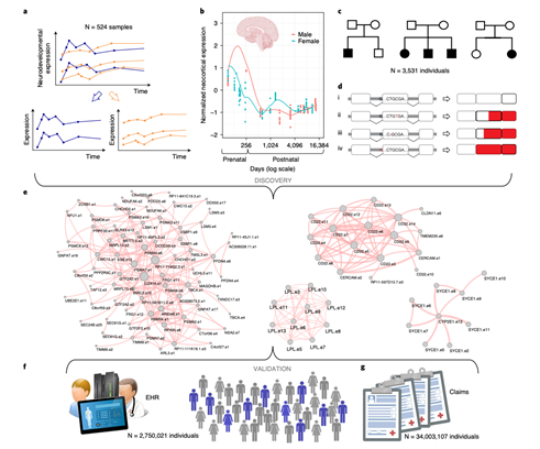 用于识别导致自闭症的分子网络的独立信息源。A.通过对发育中的人类大脑RNA-seq数据进行聚类分析,鉴定出神经发育共同调控的外显子。B.男性和女性之间的差异表达。C.在WES数据中检测到的3531个自闭症患者个体。D.用于鉴定LGD(基因破坏)变异的各种基因模型。E.信息流被整合。 F,G.使用大型EHR(电子健康记录)数据和大量健康声明健康数据对血脂异常导致的非综合征性ASD进行验证用于识别导致自闭症的分子网络的独立信息源。A.通过对发育中的人类大脑RNA-seq数据进行聚类分析,鉴定出神经发育共同调控的外显子。B.男性和女性之间的差异表达。C.在WES数据中检测到的3531个自闭症患者个体。D.用于鉴定LGD(基因破坏)变异的各种基因模型。E.信息流被整合。 F,G.使用大型EHR(电子健康记录)数据和大量健康声明健康数据对血脂异常导致的非综合征性ASD进行验证自闭症被认为是在产前大脑发育过程中产生的,且受每个个体内多个基因组变异的驱动,于是研究人员对人类早期大脑发育过程中的基因外显子簇进行了研究。