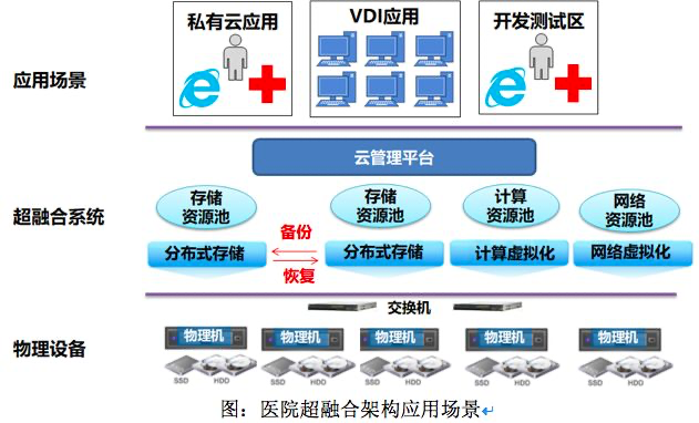 超融合是利用分布式存储技术、软件定义技术将服务器、存储、网络融合在一个节点上,然后可以通过扩展节点实现资源扩展,可以说它是一种可行有效的技术,可以替代传统虚拟化应用场景的硬件架构,而目前医院的越来越多应用在虚拟化环境运行,所以医院应用超融合的需求和条件是具备的,未来是否成为趋势,则需要考虑与传统架构成本对比是否逐步有优势。