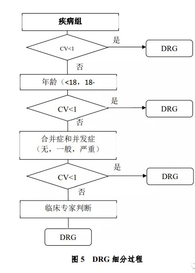 若疾病组内住院费用或住院时间的变异系数小于 1,可认为组内资源消耗的一致性高,疾病组可作为一个 DRG。反之,若疾病组内住院费用或住院时间的变异系数大于或等于 1,可认为组内病例消耗的资源不同,应该按照影响的因素(年龄、合并症和并发症等)进一步细分,直到组内的变异系数小于 1 为止。