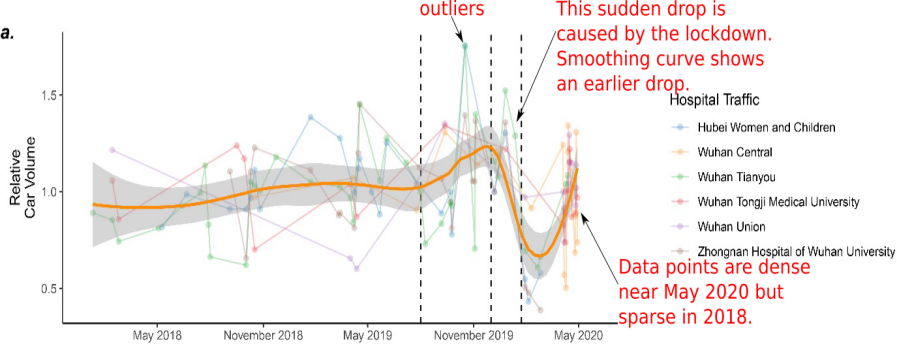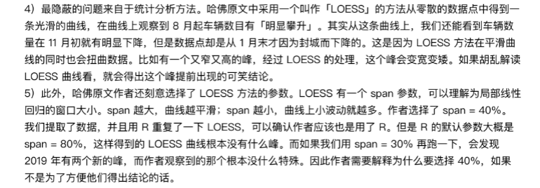 最新论文作者表示,最隐蔽的问题来自于统计分析方法。他们指出,前文“胡乱”解读LOESS曲线,从而让医院车流量峰值提前出现。