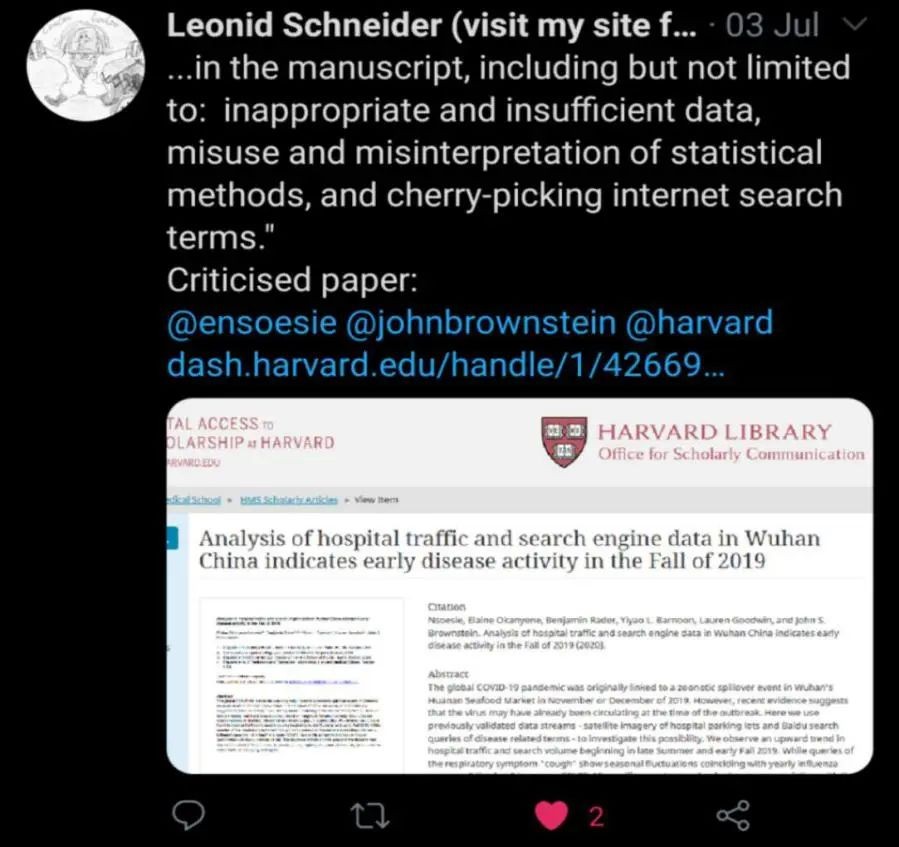 7月3日,Leonid在推文中转发了评论文章的手稿,指出前文含有的不当之处,并@了哈佛前文作者。