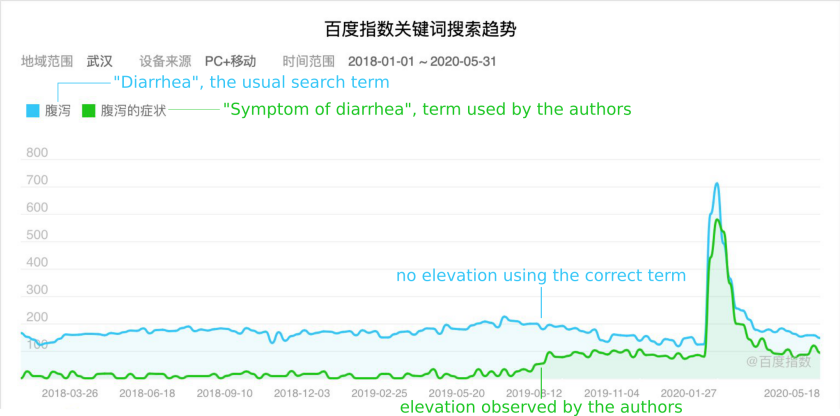 同时,作者指出前文在百度搜索方面还存在“摘樱桃”的问题。“‘采樱桃’学名‘隐瞒证据’,只汇报对结论有利的证据,隐瞒对结论不利的证据。这是学术不端的灰色地带。”陈浩说,“因为通常可以找其他理由来解释隐瞒的证据,比如仪器没调好之类。可惜哈佛团队的‘仪器’是互联网,类似的理由他们没有。”评议文章作者指出,前文作者搜索时特意选择了唯一的关键词“腹泻的症状”来支持搜索上升的结论,若用通常使用的“腹泻”一词,搜索量上升根本无法重现。且“腹泻的症状”有上升是全国范围内都出现的现象,并非武汉独有(如上图)。