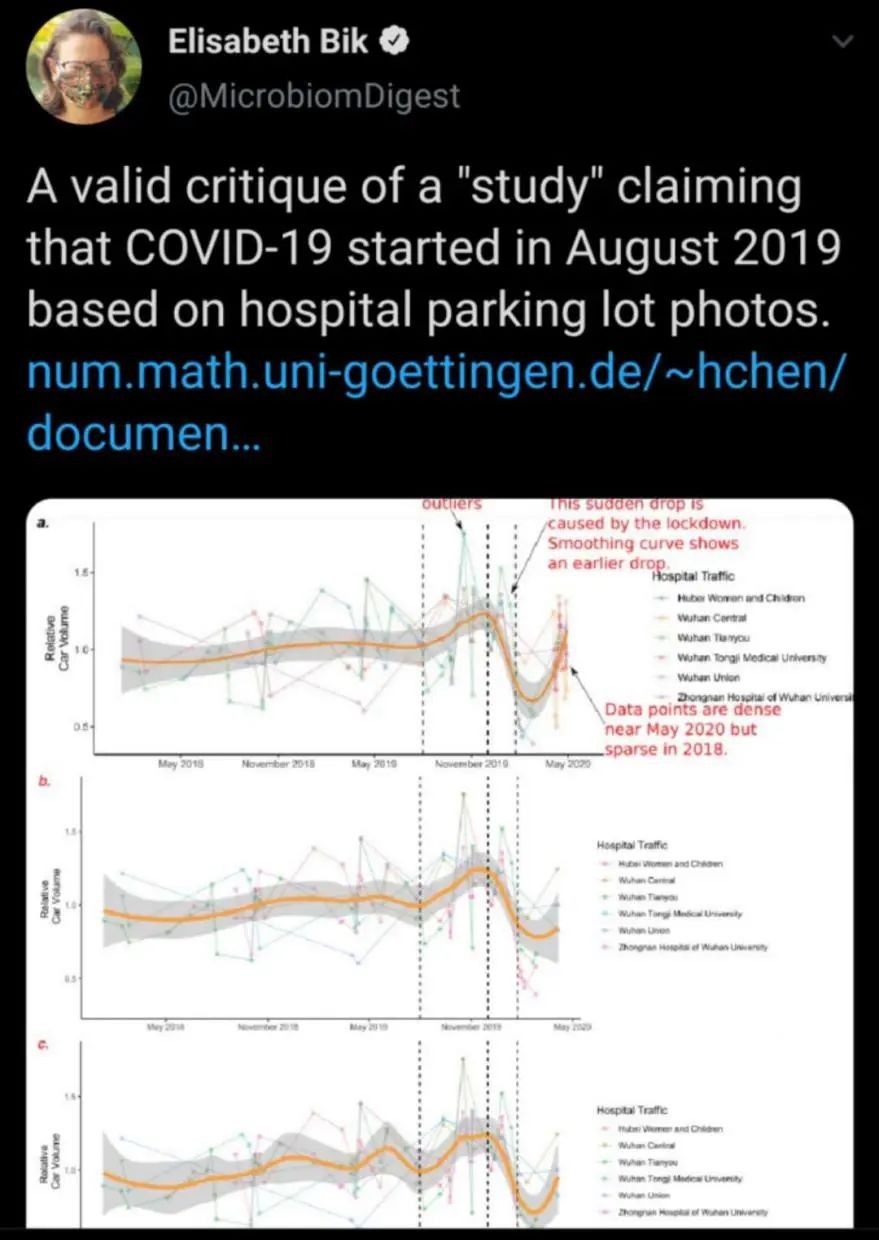 在其推文中, Bik表示,这是对“基于医院停车场照片声称2019年8月新冠肺炎暴发的‘研究’的有效批评”。