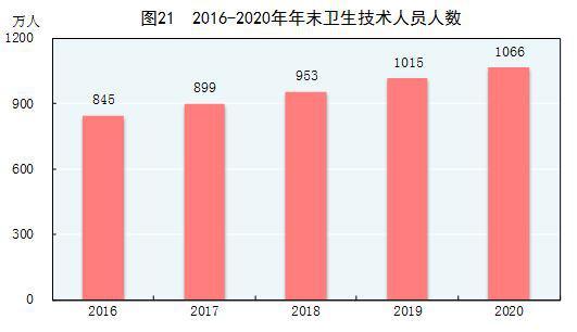 年末卫生技术人员1066万人,其中执业医师和执业助理医师408万人,注册护士471万人。医疗卫生机构床位911万张,其中医院713万张,乡镇卫生院139万张。全年总诊疗人次78.2亿人次,出院人数2.3亿人。截至年末,全国累计报告新型冠状病毒肺炎确诊病例87071例,累计治愈出院病例82067例,累计死亡4634人。全国共有8177家医疗卫生机构提供新型冠状病毒核酸检测服务,总检测能力达到1153万份/天。