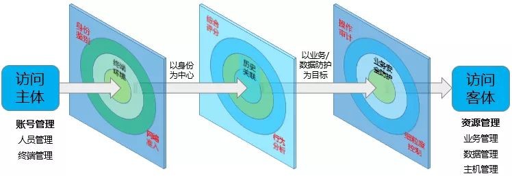 在实际建设过程中,最重要的是管住人,管住身份。因此我们提出优先建设以身份为中心的数据管控方案,以“人”为中心刻画“数据”行为画像的思路,依托行为基线分析评估数据的异常访问行为实现账号的全生命周期管理。医院中有形形色色的人,包括:科室医生、护士、系统管理员、第三方开发商、系统运维人员、安全服务人员等等,充分考虑不同角色的业务访问诉求,给每一类人员分配不同的数据通道和控制策略,建立起人-管理门户-安全管控措施-访问资源的链条,此链条的有效运转下大部分数据安全问题就能得到控制。