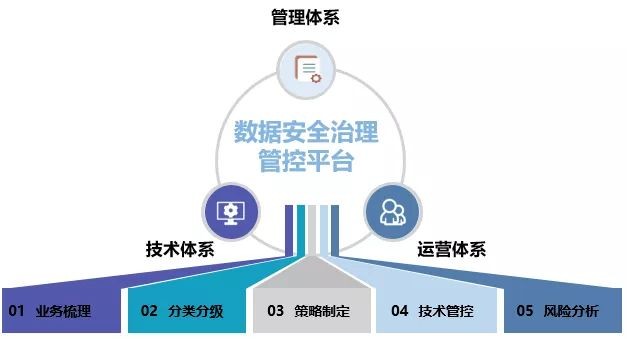 而更完整的数据安全治理体系则是以“一个中心、三大体系、五个阶段”为总体建设思路,逐步完善数据安全管控与治理。以数据安全治理管控平台为中心,通过技术体系、管理体系、运营体系同步建设,根据数据业务场景,采用分阶段实施,逐步解决数据安全的风险点,最终实现“内控外堵”的数据安全整体管控体系。