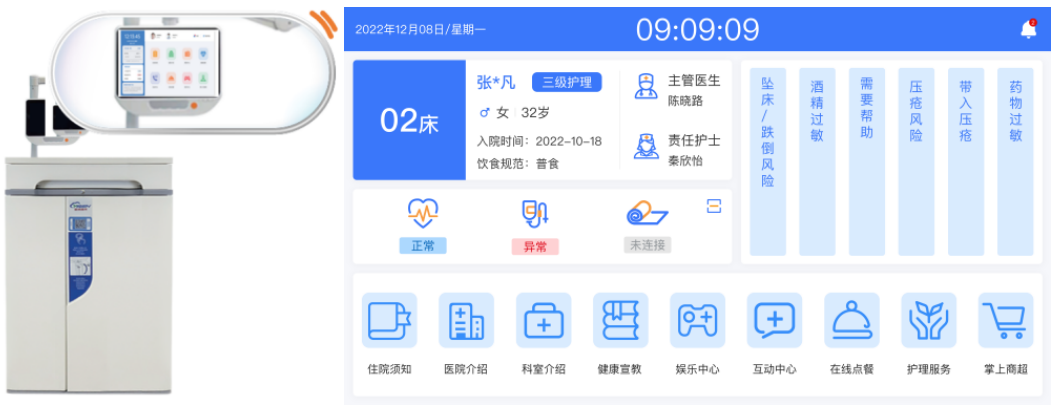 对接医院的信息系统及患者PAD,将病区患者关键信息进行汇总统计,有助于减少护士工作量,节省时间和资金成本;提升护理质量和提高患者满意度,实现“把时间还给护士,把护士还给病人”。