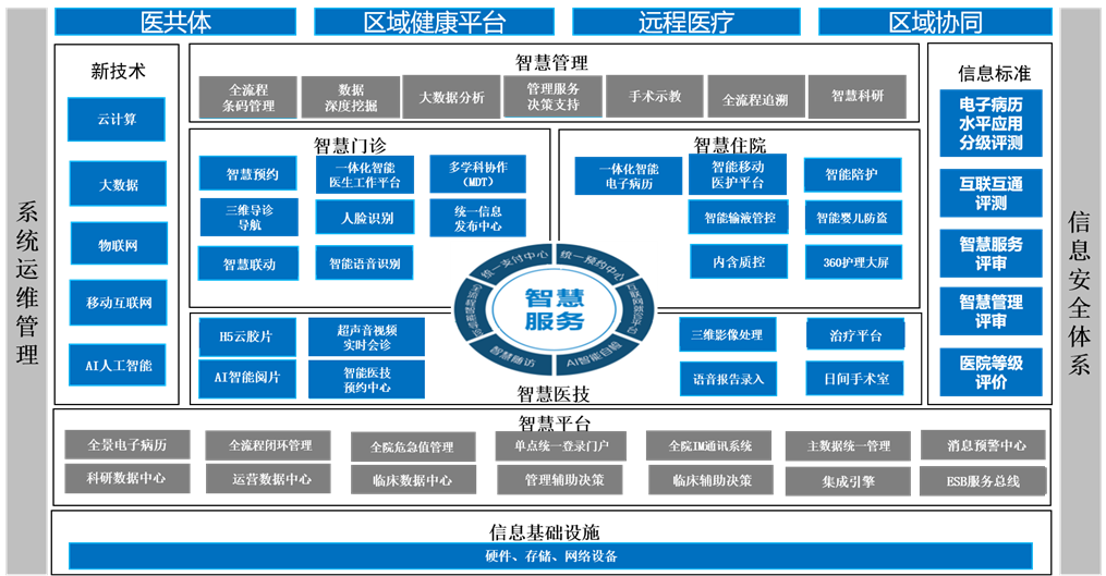 我国医疗服务发展正处在从“信息化”向“智慧化”过渡的关键阶段,国家卫健委提出要求,要总结医院信息化建设实践,建立医疗、服务、管理“三位一体”的智慧医院系统。智慧医院建设的源动力来自于政策、经济、社会以及技术等各方面的驱动因素,总结为以下四个方面:基于患者服务驱动、基于医疗政策驱动、基于医院管理驱动、基于高新技术驱动。天健基于二十余年对医疗信息化行业的经验积累,结合1000多家医院的实践应用和深度调研,通过对宏观环境和微观因素等多维度地分析,提出了天健“智慧医院”顶层设计、技术架构、基本内容及建设方法,为各级医疗机构在建设智慧医院方面提供整体的解决方案。