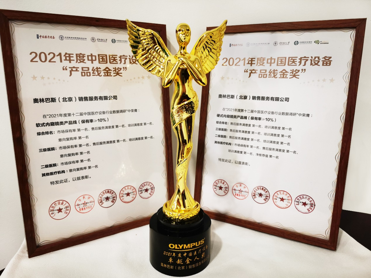 2022年7月15-17日,第十二届中国医疗设备行业数据发布大会暨中国医疗产业发展论坛线上召开。大会正式揭晓了“2021年度中国医疗设备行业数据调研”结果。在产品质量、维修质量、价格、效率、培训和服务态度六大维度及市场保有率、综合满意度、培训、净推荐值、意向复购率等核心指标考核下,医疗企业奥林巴斯凭借在行业内出色的表现及客户认可,软式内窥镜以保有率69.03%占据市场第一,硬式内窥镜保有率达23.43%,并获得了软镜“产品线金奖”、硬镜“产品线金奖”、“2021年度中国医疗设备卓越金人奖”、“最具社会责任奖”四大奖项。