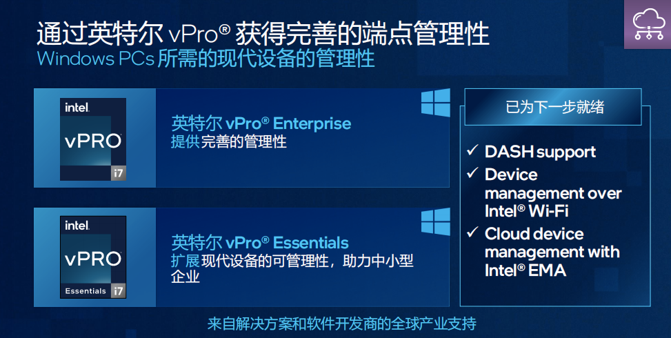 更加值得瞩目的是,最新的英特尔vPro平台包含了vPro Essentials商用平台。据了解,英特尔vPro Essentials能够将之前面向大型机构的安全和设备管理功能扩展到中小型机构的领域。可以说,它的高性价比特性所带来的降本增效能力,与县域医院建设要求不谋而合:
