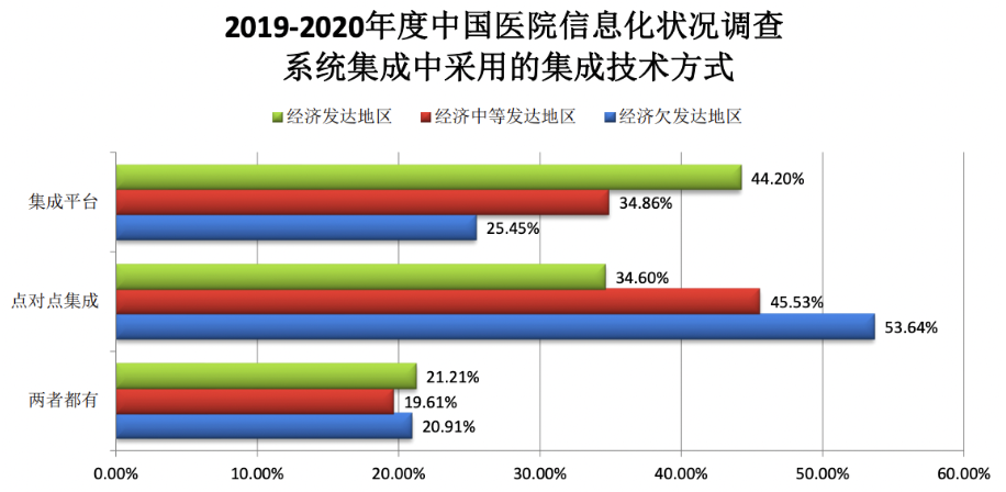 早期解决这些问题是通过点对点的方式,从《2019-2020年度中国医院信息化状况调查报告》来看,即便在互联互通成熟度标准化评测已经开展了8年的今天,在经济发达地区,点对点集成的方式仍占比高达55.81%(34.6%+21.21%)。