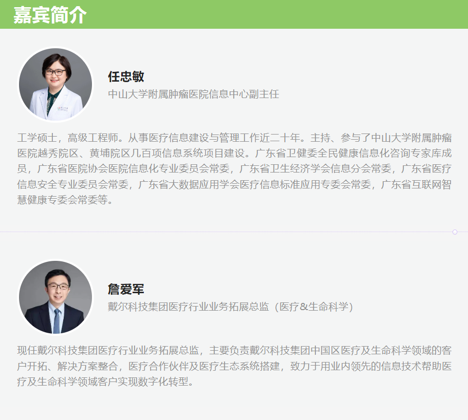本期短片特邀中山大学附属肿瘤医院信息中心副主任任忠敏、戴尔科技集团医疗行业业务拓展总监(医疗&生命科学)詹爱军,围绕“把握数字化建设内涵,全面助力医院综合能力提升”这一主题展开精彩分享。