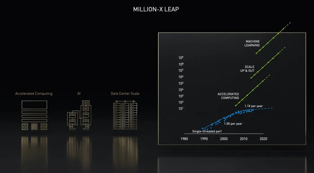 加速计算、数据中心大规模扩展,和AI的结合正在推动科学计算和工业计算的高速发展,实现百万倍的性能飞跃,从而解决气候变化、药物研发、数字孪生,等等以往最具计算挑战的问题。