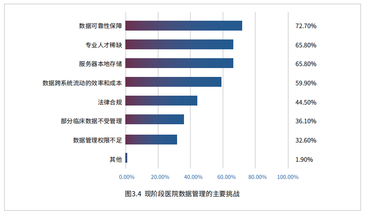 调研结果显示,当前医疗机构数据量均处于增长状态,在参与调研的样本中,HIS数据增量为1TB以内的医院占比最高、PACS数据增量在1TB-50TB区间内的医院占比最高。(详情参见完整报告)