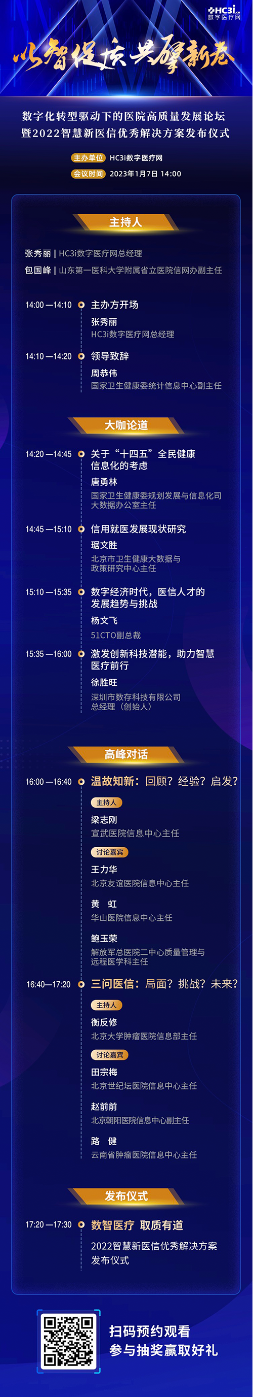 如何以智促质、擘画新的发展蓝图?2023年1月7日,HC3i数字医疗网将于线上召开“数字化转型驱动下的医院高质量发展论坛”,届时数字医疗领域领导和专家代表将齐聚一堂,共同回顾2022、展望2023,践行温故知新、砥砺前行的使命,携手共促行业繁荣。