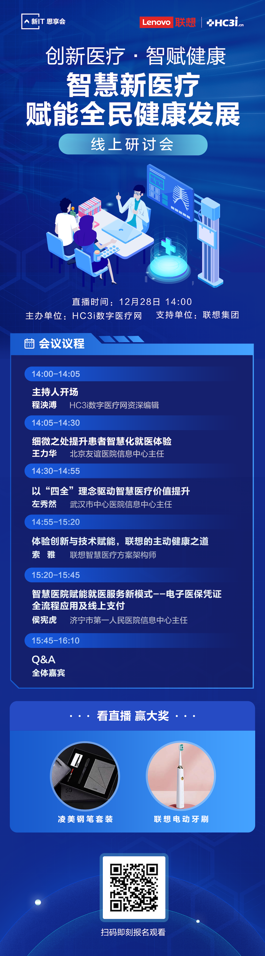 基于此背景,HC3i将联合联想集团,于2022年12月28日共同举办“智慧新医疗赋能全民健康发展”线上研讨会。会议将邀请北京友谊医院信息中心主任王力华、武汉市中心医院信息中心主任左秀然、济宁市第一人民医院信息中心主任侯宪虎、联想智慧医疗方案架构师索雅,共同就全民健康背景下智慧医疗建设展开精彩分享和交流。