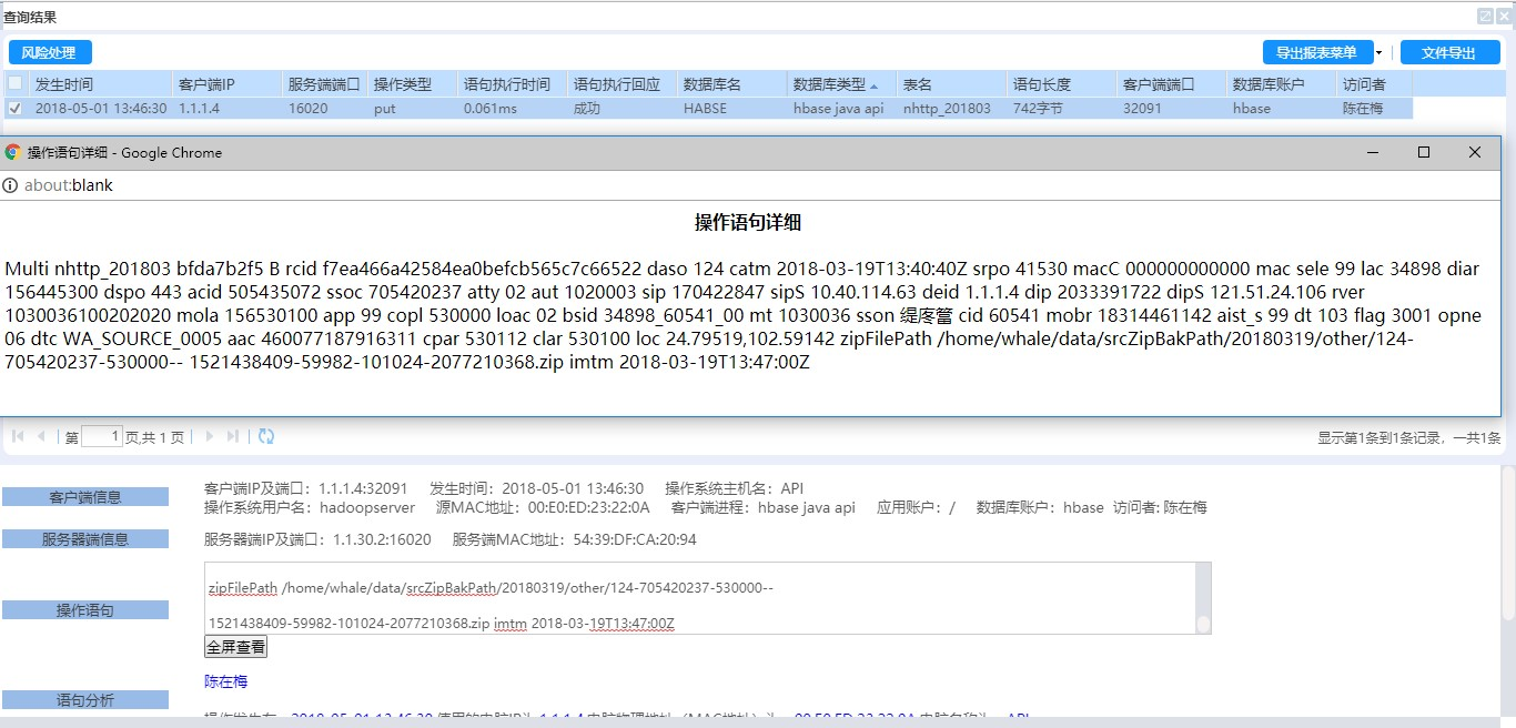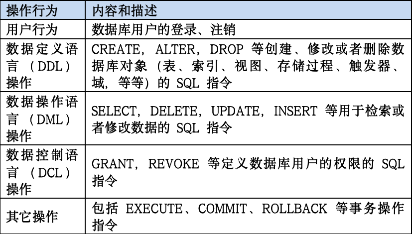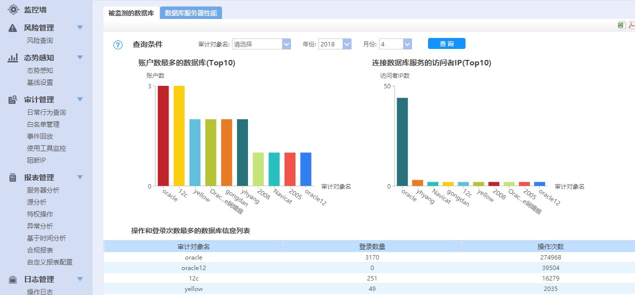 此方案中将用户登陆、数据操作、退出整个过程无死角监控,其中包括账号登陆、注销、数据的增删改、视图创建、表结构的更改、权限变更、导库等各类数据库操作进行全面监控与审计。