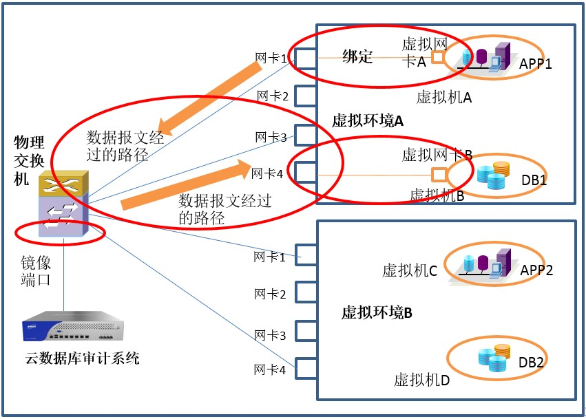 这个时候我们的解决方案是将数据库审计监控系统由硬件形态转变为虚拟化软件形态,直接驻留在云平台中,直接在虚拟交换网内部对数据库进行审计及监控。此时数据库审计监控手段转变成云平台中的一个安全组件,就象“云防火墙”一样。这种情况下,需要对虚拟交换网络的配置进行更改,在虚拟交换内部,对需要监控的DB,APP,做流量镜像,将流量引入到我们的数据库审计中来,从而完成审计监控。如下图所示: