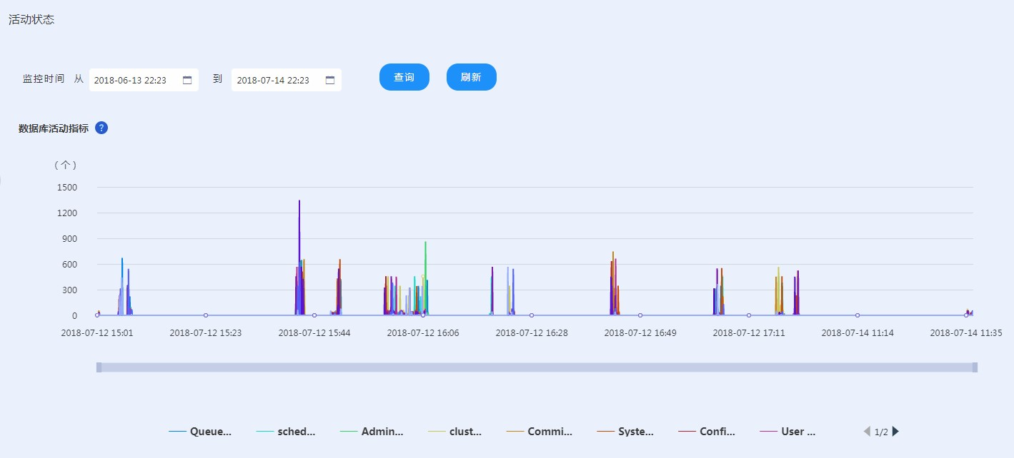 通过活跃事务可以查看当前正在执行的事务,通过这些信息了解数据库执行次数较多的事务了解数据库的运行状况。可以查询历史的数据,也可以查询实时的活跃事务,每五秒进行一次数据刷新。