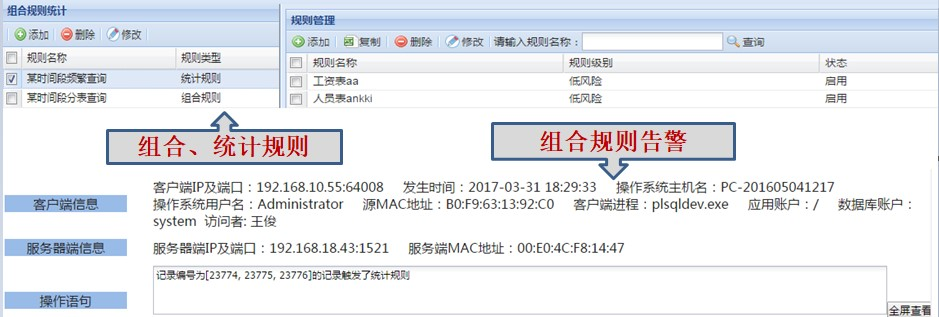 实时告警:违规接入和越权操作实时短信通知DBA,统方行为以邮件形式通知纪检部门,无需24小时监控,遏制统方行为的发生
