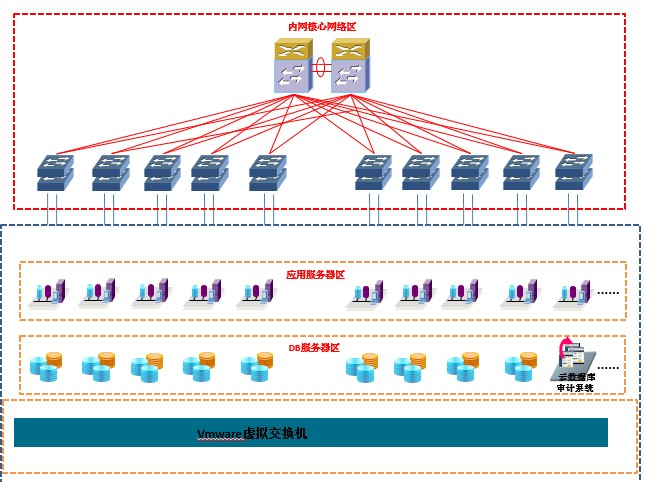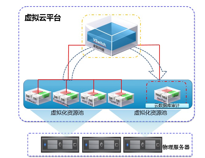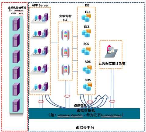 私有云架构下一般用于中小型企业内部虚拟化建设使用,实际访问流量还需经过客户的硬件交换机,这种架构,与传统的信息化架构从数据库审计的角度分析,没有本质差别,仍然可以沿用交换机旁路抓报的技术。