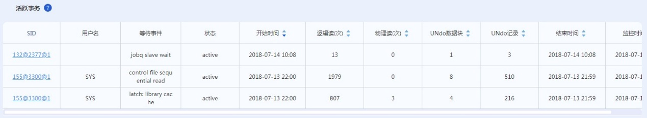 注:活动状态、阻塞活动、活跃事务三个功能可进行联合排查。例如:先手查看活动状态UserI/O参数在柱状图上是否有值异常过高的显示,如果有,通过介绍得知UserI/O是由用户I/O操作引起的的等待事件,就可以同时查看阻塞活动和活跃事务去排查问题。