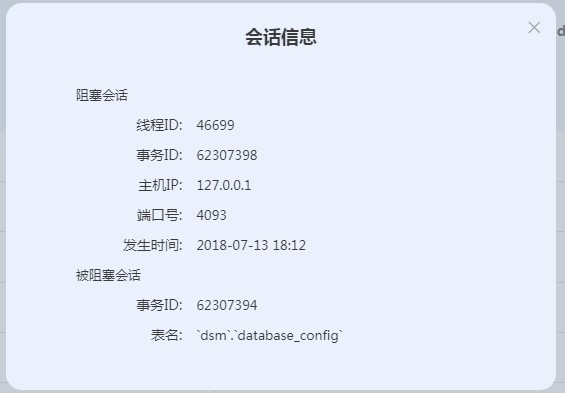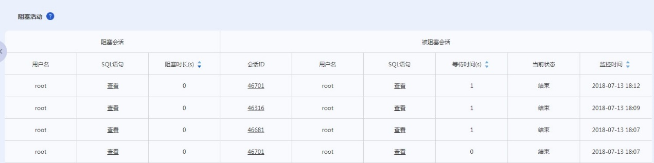 通过阻塞活动页面能够清晰明了地知道阻塞活动的详情:执行的语句,事物ID,线程ID,被阻塞的表,发生的时间以及查询的IP地址等信息。通过这些信息能够知道某个时间数据库性能的问题,是否与阻塞有关,同样可以通过这些信息能够精确定位到阻塞的语句和被阻塞的语句等等信息,之后能够快速地解决阻塞的问题。防止出现锁表等其他问题,优化数据库的性能。而且还能实时查询当前的数据库中是否出现阻塞的sql语句。监控效果如下图: