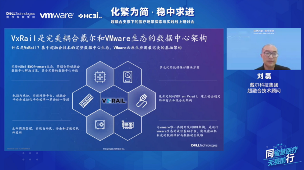 戴尔科技集团超融合技术顾问刘磊在演讲中表示,随着医院业务场景的扩增,医疗应用的数量和种类也越来越多,这就导致作为底层支撑的基础架构不断扩展,变得日渐“臃肿”。面对这一现状,越来越多的医院选择超融合架构来提供支撑。首先,通过超融合技术,不仅能够实现服务器与存储功能的耦合,通过更少的界面实现对大型数据中心的管理,有效提升管理效率;其次,超融合架构可以非常方便的实现在线系统的升级和扩容;第三,超融合架构上的每个节点能够用于应对负载压力,进而自动实现负载均衡,同时规避资源与性能方面的瓶颈,具有更高的可靠性;最后,由于超融合架构的新节点能够加在原有集群中,形成统一集群来实现共同服务,因此具有杰出的利旧能力。