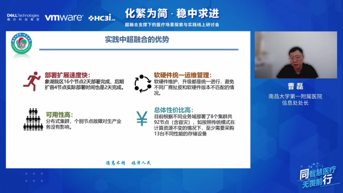 2023年8月15日,《超融合支撑下的医疗场景探索与实践》线上研讨会顺利召开,中国医科大学附属盛京医院(以下简称盛京医院)计算机中心主任全宇、南昌大学第一附属医院(以下简称南昌大学一附院)信息处处长曹磊、戴尔科技集团超融合技术顾问刘磊、VMware资深解决方案架构师曹克勇共同出席本次研讨会,通过精彩演讲和热烈交流,分享超融合技术实践的相关经验、探索超融合技术在医疗行业的创新应用模式,为广大信息化建设者探索超融合技术的应用与创新提供了宝贵借鉴。