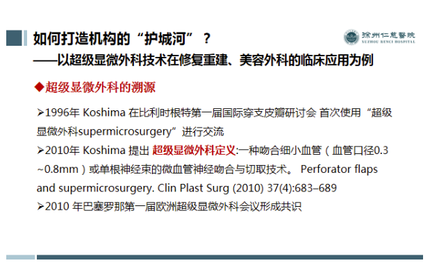 近年来,徐州仁慈医院拓展超级显微外科的应用领域,在泛亚洲太平洋地区面部整形与重建外科学会常务理事兼中国区主席、中国医师协会常务理事李世荣教授和徐州仁慈医院理事长宗亚力的共同推动下开展超级显微外科,引进放大50倍的超级显微镜,使用更细的12-0缝合线操作完成超级细小、超级疑难的显微外科手术。在面部组织块再植、体表器官再造,淋巴静脉吻合治疗肢体淋巴水肿等修复重建领域取得了成功。其中自体脂肪移植联合脉冲染料激光对深二度烧伤后的皮肤瘫痕治疗效果得到社会认可,小儿先天手畸形的美学矫形引领国内先进水平,DIEP在乳腺癌术后乳房再造获得患者满意效果,面部缝合与指端美学再造在国际产生深远影响。