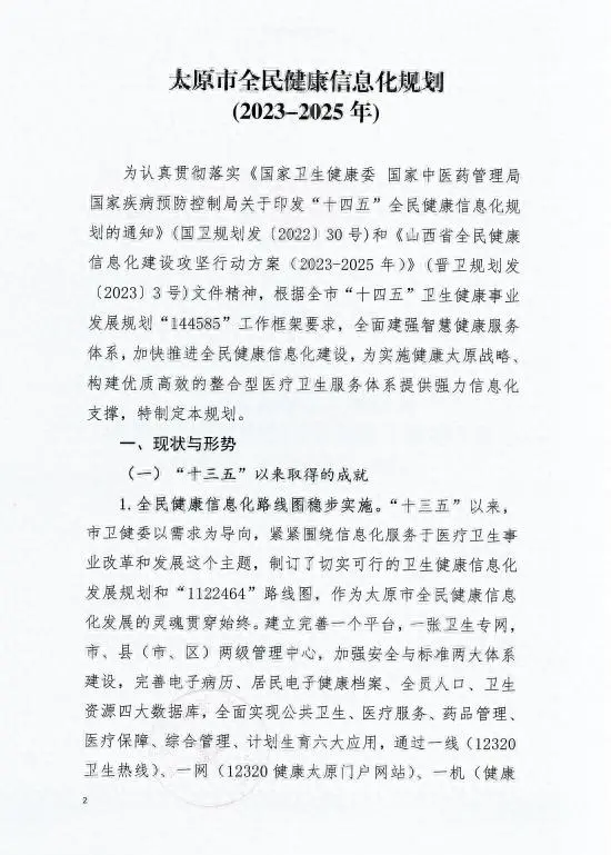 为推动“十四五”期间全民健康信息化发展,贯彻落实国家和省卫生健康信息化建设要求。近日,太原市卫健委印发太原市全民健康信息化规划(2023-2025年),为构建优质高效的整合型医疗卫生服务体系提供强力信息化支撑。