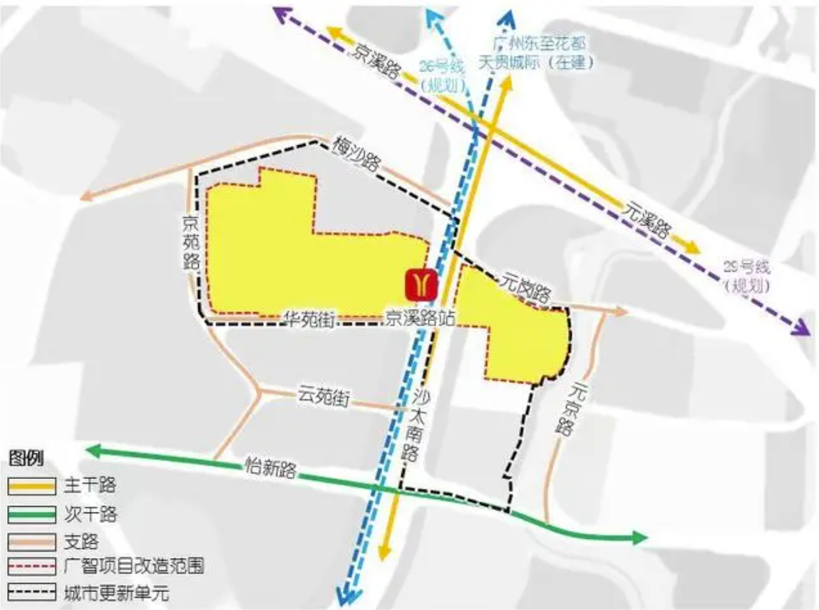 京溪同和片区是白云区东部生命健康发展轴的南部功能节点,是白云区发展生命健康产业重要抓手。2023年10月10日,《白云区京溪广智片区城市更新单元详细规划》经第4届广州市规划委员会地区规划专业委员会第13次会议审议通过,将通过城市更新,促进片区产业转型升级、城市面貌及空间品质提升,打造智慧医疗创新基地。