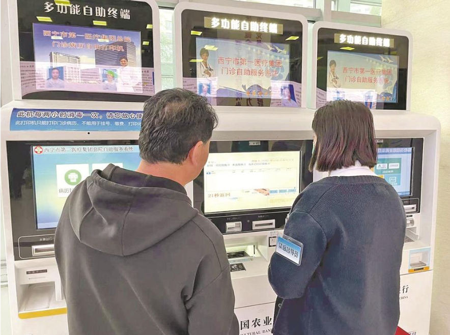西宁市第一医疗集团总院导诊人指引患者在自助机上打印检查报告