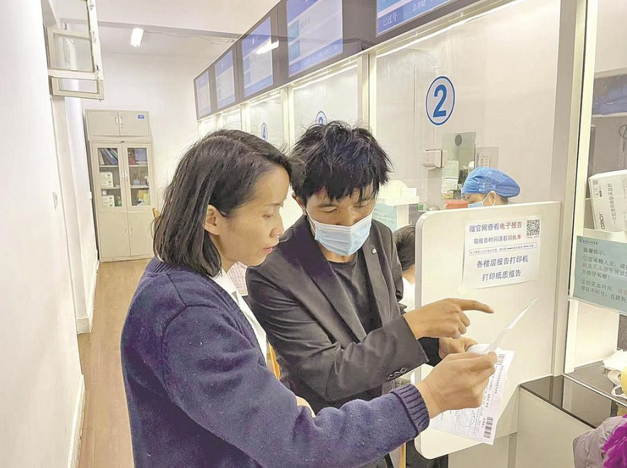 青海省人民医院门诊办公室主任安玉秀(左)给患者查看检查单