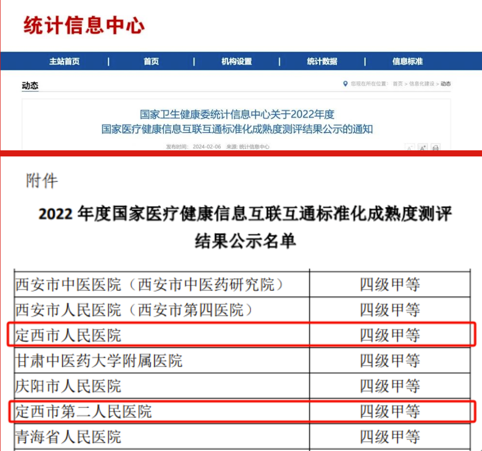 2024年2月5日,国家卫生健康委统计信息中心发布了2022年度国家医疗健康信息互联互通标准化成熟度测评结果,定西市人民医院、定西市第二人民医院顺利通过国家医疗健康信息互联互通标准化成熟度四级甲等测评。目前,甘肃全省通过测评的医院共11家,定西市2家医院占全省通过测评的5家地市级医院的40%。