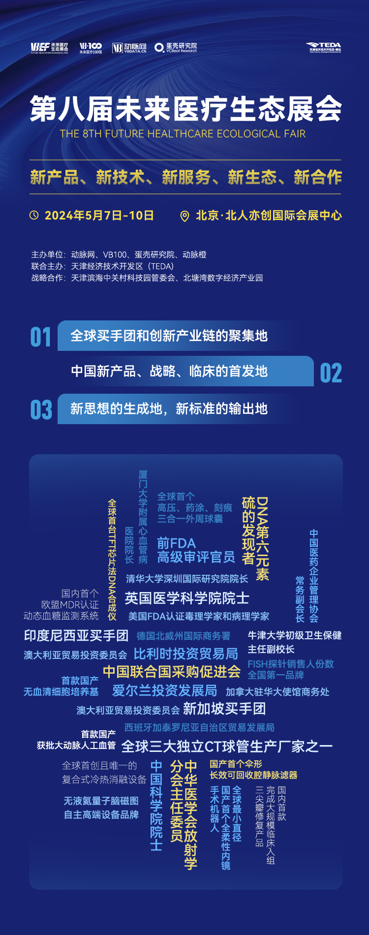 2024年,第八届未来医疗生态展会以“新青年”为主题,由VB100、动脉网、蛋壳研究院、动脉橙主办,天津经济技术开发区(TEDA)联合主办,天津滨海中关村科技园管委会、北塘湾数字经济产业园战略合作支持,将于2024年5月7日-10日在北京·北人亦创国际会展中心盛大举行。本届展会为15000+人次、10000平规模,围绕新产品、新技术、新服务、新生态、新合作构建体系,为医疗健康产业的创新力展示搭建最佳舞台。