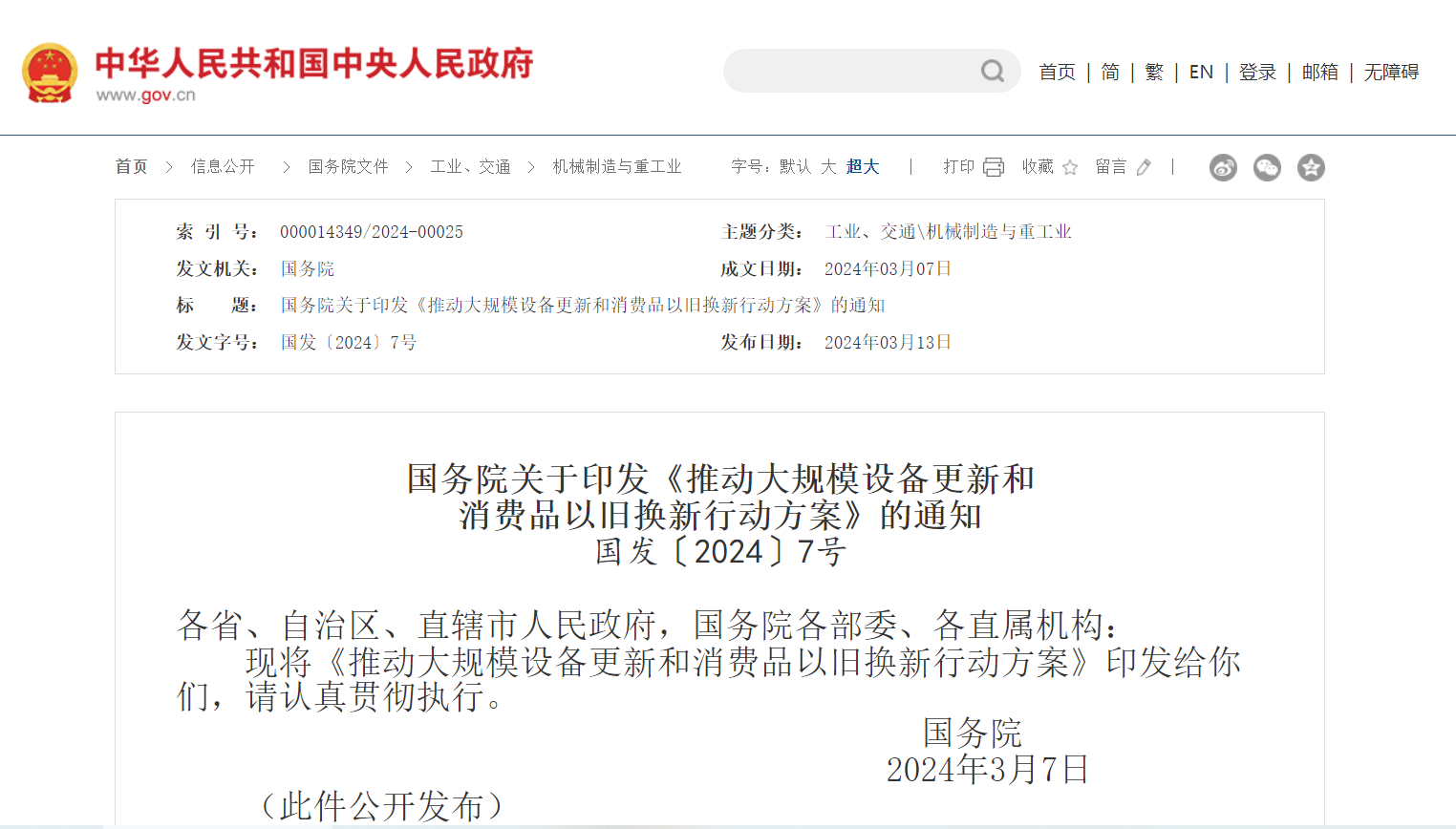 今年1月,国家发改委印发《关于发布〈重点用能产品设备能效先进水平、节能水平和准入水平(2024年版)〉的通知》,提出加快提升产品设备节能标准,支撑重点领域节能改造,助力大规模设备更新和消费品以旧换新。”