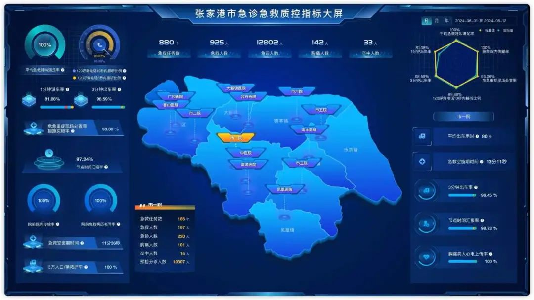 为了进一步完善院前急救应用系统,打通院内、院前信息互通,进一步完善急诊、急救平台信息应用,张家港市于2022年启动智慧医疗急救能力提升项目,组建了由全市13家医院组成的区域急救协同平台,建设内容涵盖院前120急救数据采集、院前院内信息互联、急诊急救诊疗数据汇聚以及胸痛、卒中等重大疾病填报等急诊急救全流程相关业务,并设定11个急救业务指标进行系统运行质控评价。