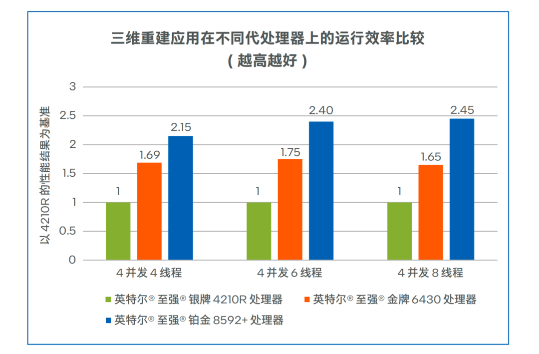 在不同代英特尔®至强®可扩展处理器上进行测试,结果显示,在处理器开通4并发8线程时,第五代英特尔®至强®铂金8592+处理器的三维重建效率,相比第二代的英特尔®至强®银牌4210R处理器提升达2.45倍,让三维影像的交互更加流畅顺滑。