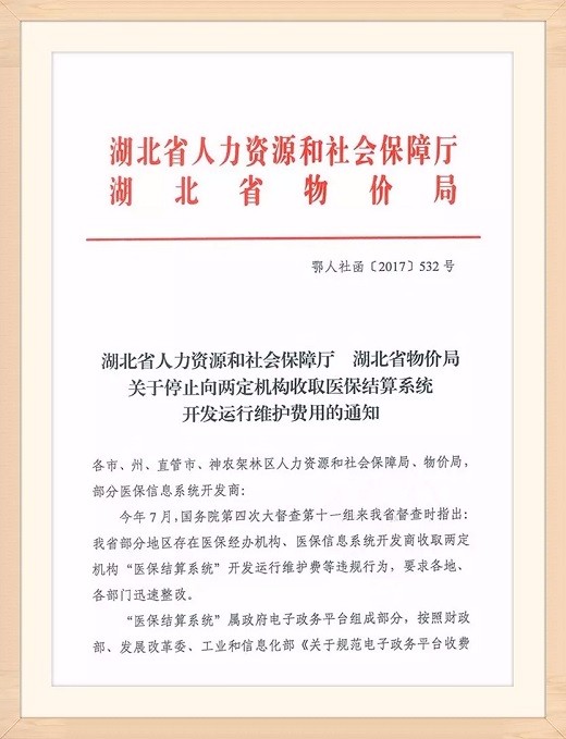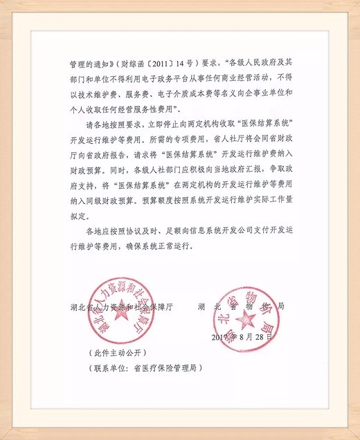 文件要求湖北各地人社局、物价局、部分医保信息系统开发商按照要求,立即停止向两定机构收取“医保结算系统”开发运行维护等费用。所需的专项费用,湖北省人社厅将会同省财政厅向省政府报告,请求将“医保结算系统”开发运行维护费纳入财政预算。同时,各级人社部门应积极向当地政府汇报,争取政府支持,将“医保结算系统”在两定机构的开发运行维护等费用纳入同级财政预算,预算额度按照系统开发运行维护实际工作量拟定。