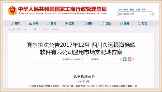 2016年9月15日,经国家工商行政管理总局授权,四川省工商行政管理局对四川久远银海畅辉软件有限公司(以下简称“银海公司”)涉嫌滥用市场支配地位强制搭售的垄断行为进行立案调查,于2017年8月3日对涉案当事人作出行政处罚决定。