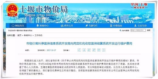 这则《市物价局叫停医保信息系统开发商向两定机构收取医保结算系统开发运行维护费用》的通知指出:根据湖北省人社厅、湖北省物价局《关于停止向两定机构收取医保结算系统开发运行维护费用的通知》要求,十堰市物价局迅速行动,于2017年9月20日起对该市两定机构交纳医保结算系统开发运行维护费用的情况进行了调查。在调查了解的基础上,十堰市物价局督促收费单位立即进行整改,目前医保结算系统的开发商东软公司已全面停止向两定机构收取开发运行维护费用。