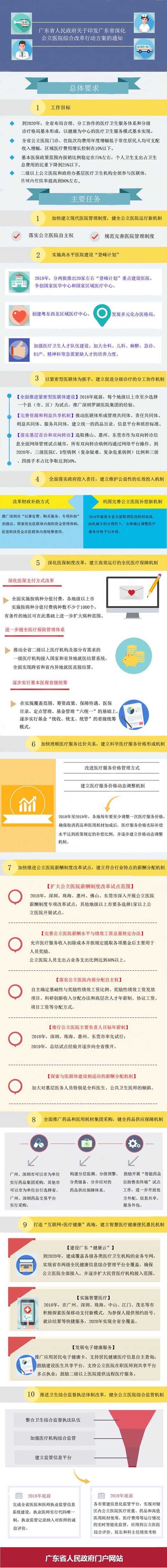 19日,广东省人民政府出台《广东省深化公立医院综合改革行动方案》(以下简称《方案》),推出“综改十条”,在现代医院管理制度、高水平医院建设、医联体建设、财政投入、医疗保障、医疗服务价格、薪酬制度、药品耗材采购、互联网+医疗健康、综合监管等十大方面确定了32项改革任务。