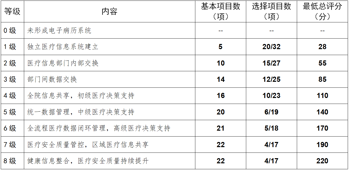 电子病历系统应用水平划分为9个等级。每一等级的标准包括电子病历各个局部系统的要求和对医疗机构整体电子病历系统的要求。