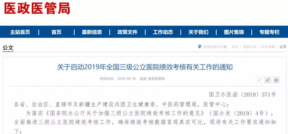 4月19日,国家卫生健康委、国家中医药管理局联合发布《关于启动2019年全国三级公立医院绩效考核有关工作的通知》。《通知》明确,将于今年6月1日开放全国三级医院绩效考核信息系统,所有三级公立医院可直接上传医院绩效考核数据。
