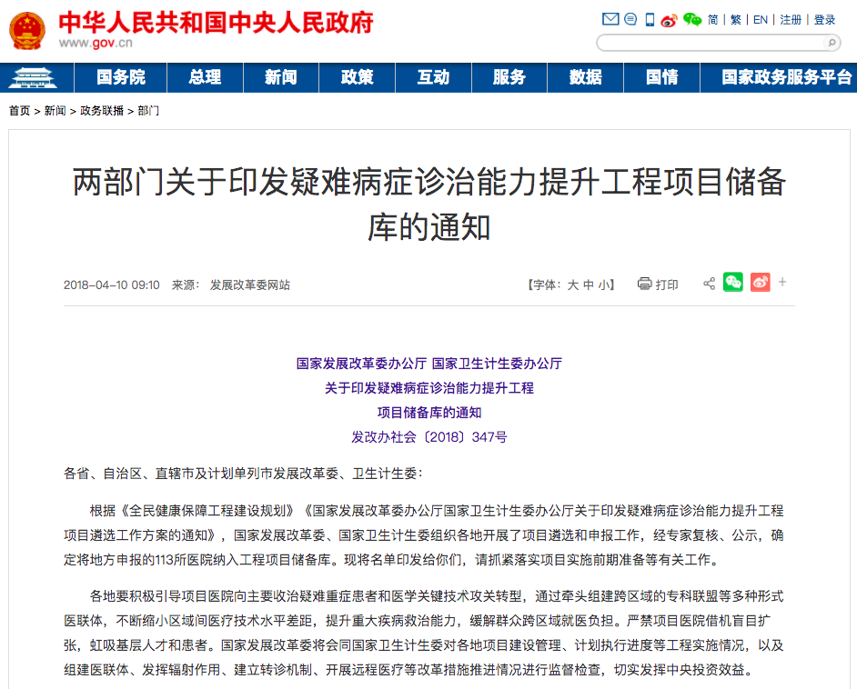 2018年4月,国家发改委、卫健委再次联合发布《关于印发疑难病症诊治能力提升工程项目储备库的通知》,公布了最终遴选出来的113所省部级医院名单。其中,北京市有8家医院入选,四川、广东、河南、上海也均有6家。