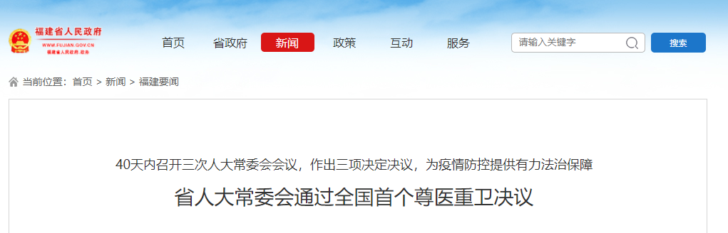 近日,全国首个关于切实保护关心爱护医务人员、营造尊医重卫良好风尚的决议经福建省人大常委会第十七次会议表决通过。