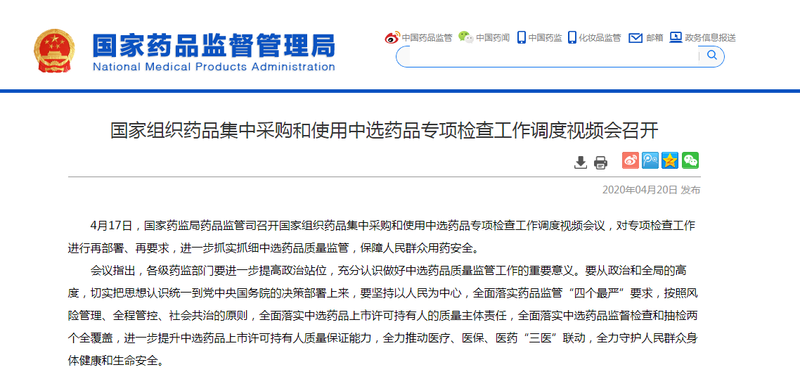 4月20日,国家药监局官网发布消息,国家组织药品集中采购和使用中选药品专项检查工作调度视频会于4月17日召开,会议要求全面落实中选药品监督检查和抽检两个全覆盖,落实中选药品“一物一码”追溯等要求。