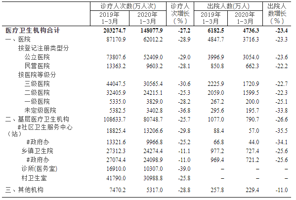 2020年1-3月,全国医疗卫生机构总诊疗人次达14.8亿人次,同比下降27.2%。
